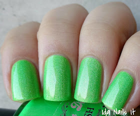 These are not jelly based holos but more like shimmer creme formula wise. Some of them required more coats for coverage than others but no more than three was needed for opacity. The holographic effect is a low to medium density one compared to the high density holo you would see in a metallic or jelly holographic polish, but that's not surprising considering the color range in this collection. They will dry to a semi-matte finish, again, not unusual with neon polishes, but a layer of topcoat will add shine.